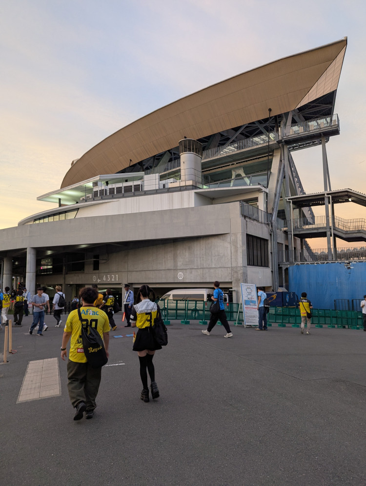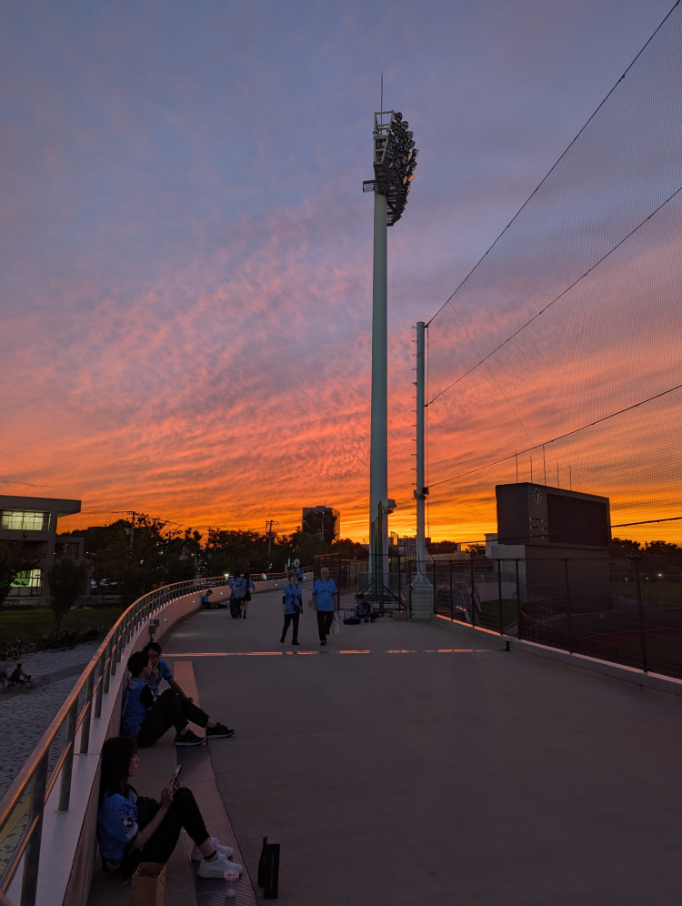Le parvis est blindé de stands (bouffe japonaise bien présente) et d’activités pour toute la famille, de la musique, des jeux, une boutique. Un parc d’attractions le truc. T’as un stade de baseball juste à côté pour mon plus grand plaisir. Et en plus je suis arrivé sur un magnifique coucher du soleil. La claque.
