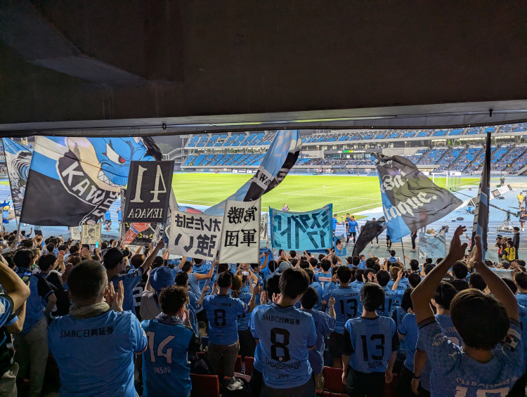 L’ambiance est très solide, et ça touche véritablement tout le monde. Les mecs, les filles, les femmes, y’a une cohésion, une communion entre tout le monde derrière le Kawasaki Frontale. D'ailleurs, à l'issue du match remporté par Kawasaki, un joueur a pris le mégaphone pour lancer un chant.