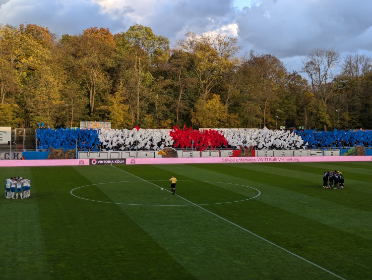 Théoriquement, il n’y a rien de bien excitant à voir un match du Viktoria Cologne. C’est un modeste club de 3. Liga avec quelques milliers de spectateurs dans un modeste complexe sportif. Mais avec la présence du Hansa Rostock, on allait forcément pouvoir compter sur un énorme parcage. Et ils ont effectivement pris toute la tribune latérale, un petit bloc à part, et on voyait également pas mal de spectateurs du Hansa dans la principale tribune latérale où j’étais. Soit bien plus que le petit groupe de quelques dizaines de supporters du Viktoria se trouvant lui dans un petit bloc derrière un virage.