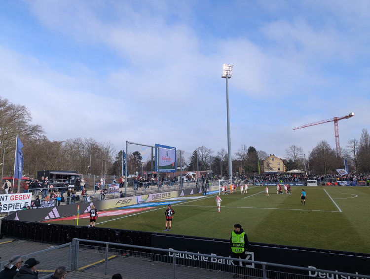 L’équipe féminine (Frauen en allemand) joue au Stadion am Brentanobad. Comme il est quasi de coutume en Allemagne, le transport public est offert pour rejoindre et quitter le stade. Et c’est à peu près la seule générosité qu’on peut signaler dans l’expérience pour rentrer dans le stade.