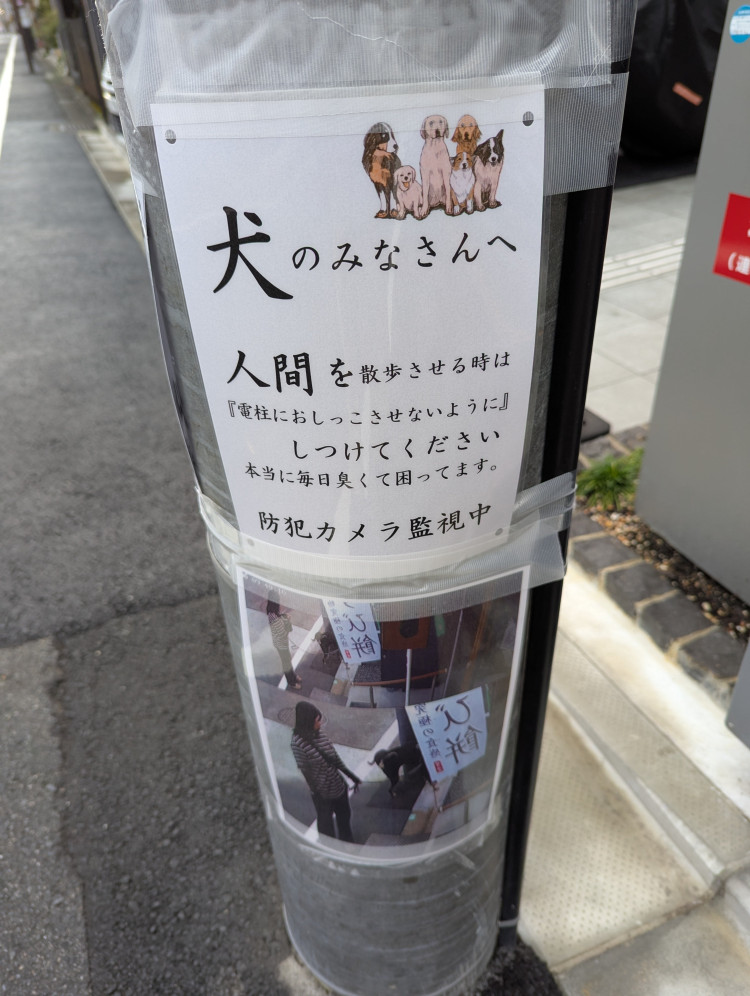 J’avais l’impression d’être dans une dystopie. C'est un environnement très contradictoire entre les usages et coutumes imposés pour former "le citoyen/employé idéal", d'une société prête à vous humilier publiquement au moindre écart de conduite (ci-dessous, le chien d'une maîtresse qui a pissé sur un poteau), et en parallèle la déviance et l'immoralité de la société japonaise pour sexualiser en permanence les corps féminins et même enfantins. Ce double jeu m'agace.