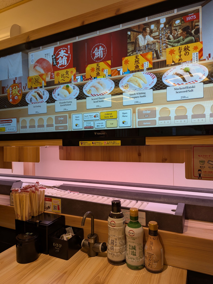 Alors sur Tokyo, j’ai fait pas moins de 4 Sushiro (là-aussi, au mauvais moment c’est 45-60 minutes d’attente). D’après les critiques, c’est la meilleure chaîne de sushis à plateau tournant. A partir de 150 yens les 2 sushis, pour une dizaine d’euros on peut s’en enfiler une vingtaine et s’offrir un dessert avec ça. Une offre variée qui évolue chaque semaine avec des exclusivités selon chaque restaurant. Sur les 4 que j’ai fait, j’en ai ainsi vu 3 assez différents. Au-delà de l’offre alimentaire qui évolue, il y’a également la décoration (Sushiro Ikebukuro Sunshine 60 très kawaii) et la prise de commande qui peuvent différer (tablette, grand écran tactile). De quoi renouveler un peu l’expérience. Ça va me manquer.